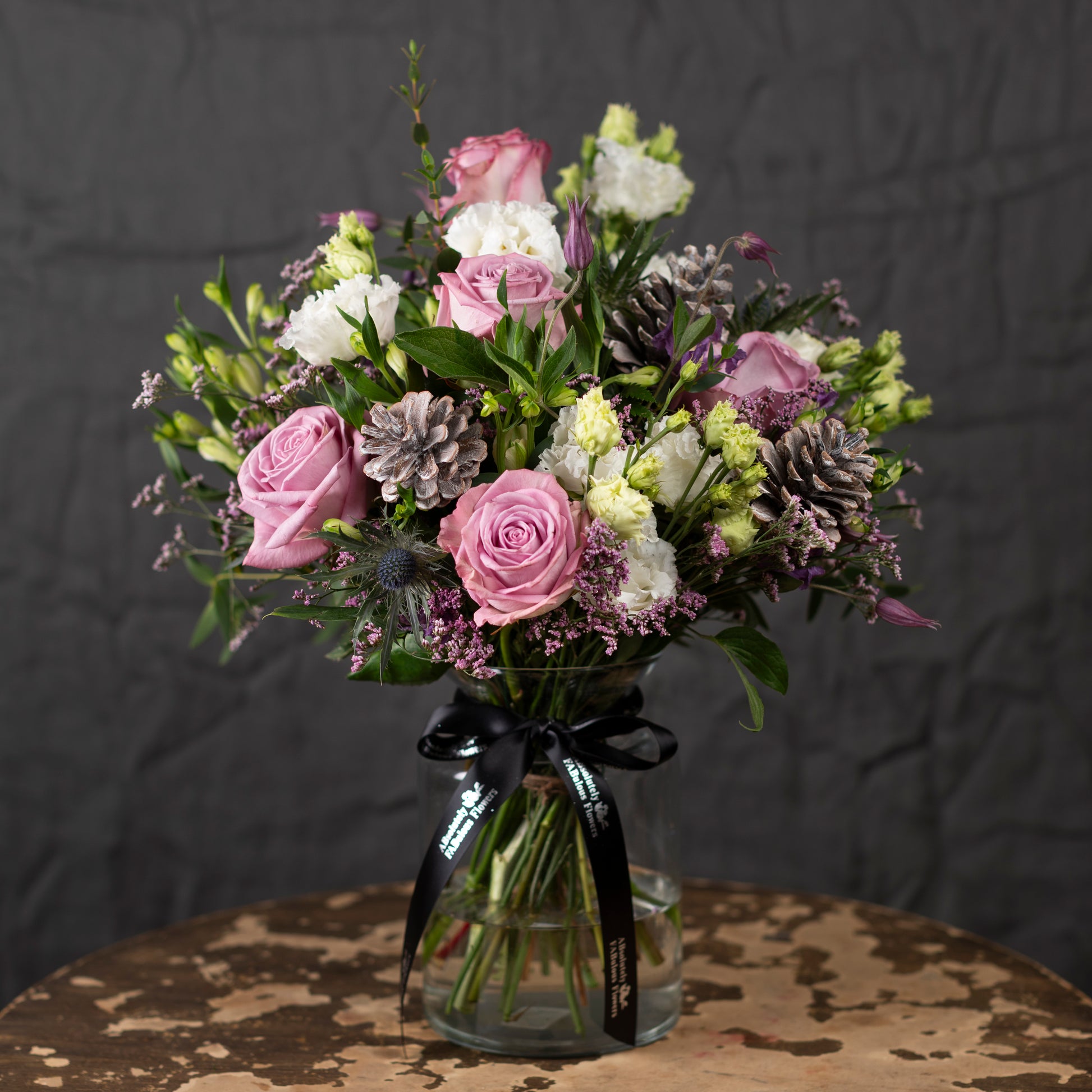 Hand tied bouquet using the freshest stems and festive pine cones in tones of pinks and whites