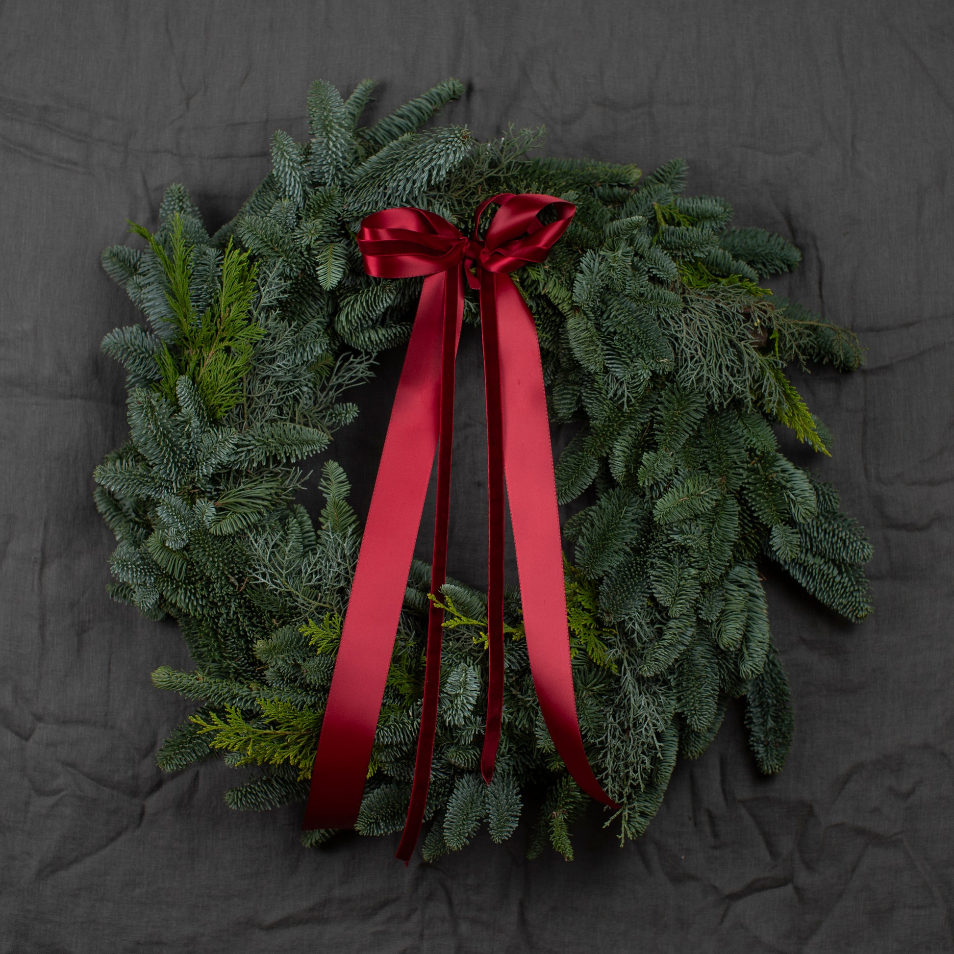Fresh Christmas Wreath bowed with a velvet ribbon. Choice of mixed or noblis. Can be dressed with seasonal fruits and cones - florist choice