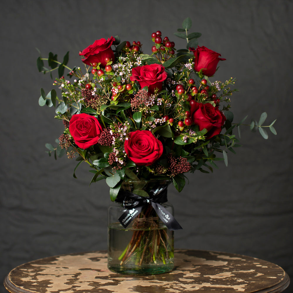 Half a Dozen Luxury Red Freedom Roses, Handcrafted by our florists, complimented by foliage and fillers, and presented in our eco friendly glass vase.